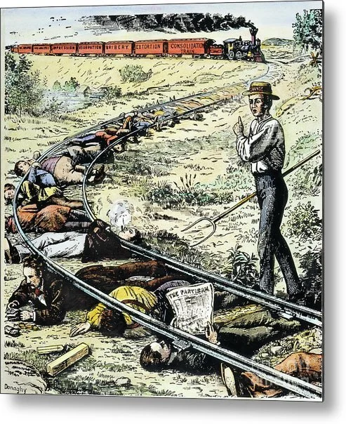 Founded in 1867, the Grange, also known as the Patrons of Husbandry, was originally an organization of farmers, dedicated to the advancement of agriculture. In its early days, the Grange had a political mission: pressuring the government to regulate railroads, which at the time engaged in various monopolistic practices. The political cartoon to the right shows the Grange attempting to rouse seemingly indifferent victims of the railroads; notice that the train cars in the background are named “Extortion,” “Bribery,” etc. At the state level, laws regulating railroad practices were frequently called “Granger laws.” Nationally, the Interstate Commerce Act of 1887 and the Hepburn Act of 1905 became law in part due to the political efforts of the Grange.